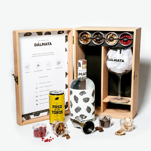Caja de Madera con botella de Dalmata clasico + Copa de cristal + Jigger medidor de acero inoxidable + 4 botánicos naturales: Canela: De sabor dulce y amaderado, con un aroma cálido y suave, la canela es mundialmente reconocida y utilizada en cockteleria. Su forma y color dan un decorado perfecto a tu trago.